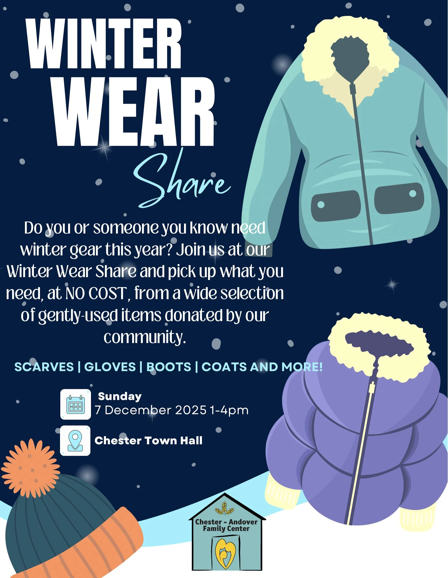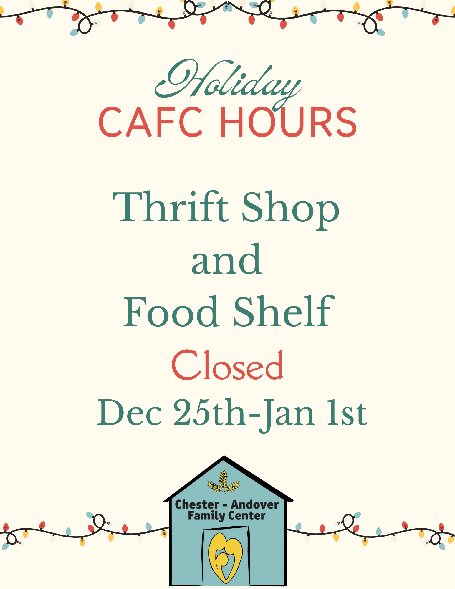 The Chester-Andover Family Center (CAFC) is a thriving 501c3 nonprofit charitable organization serving our community with three services: A Thrift Shop, Food Shelf and Financial Assistance.