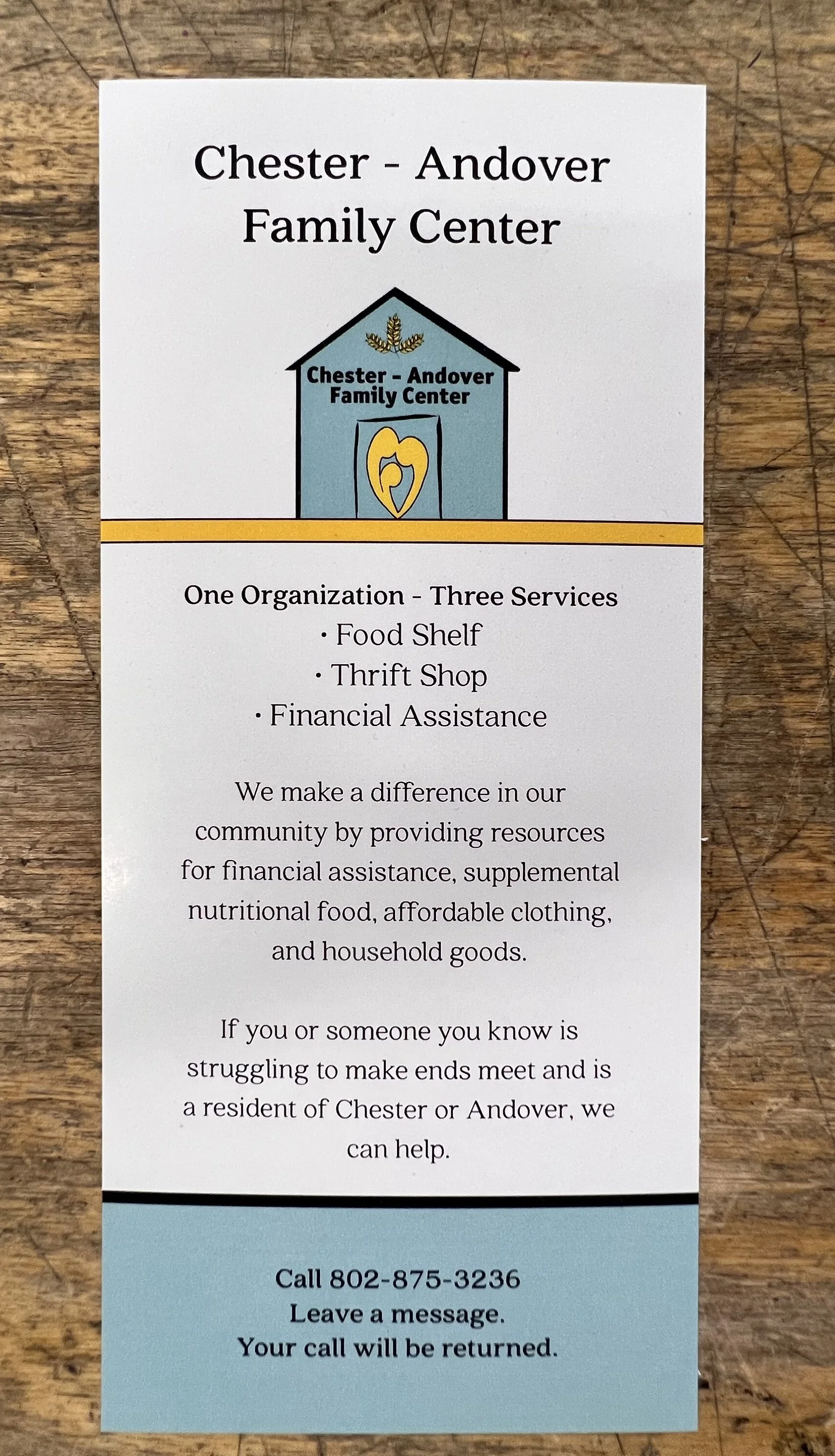 Today, the Chester-Andover Family Center is a thriving 501c3 nonprofit charitable organization serving our community with three programs: a Thrift Shop, Food Shelf and Financial Assistance.